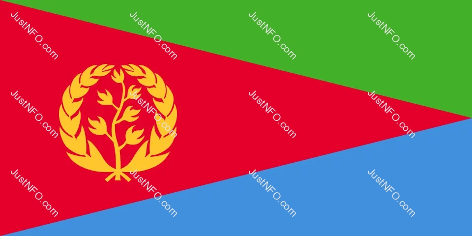 صورة علم إريتريا الرسمي المكوّن من مثلث أحمر يمتد من اليسار إلى اليمين يفصل بين مثلثين بالأخضر والأزرق، ويتوسطه شعار سنبلة الزيتون الصفراء رمز السلام والوحدة الوطنية