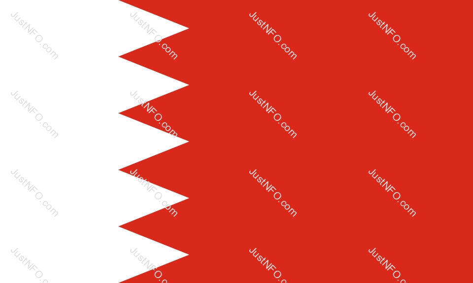 صورة علم البحرين الرسمي المكون من لونين أحمر وأبيض يفصل بينهما خط متعرج بخمسة مثلثات بيضاء، يرمز إلى السلام والشجاعة والوحدة الوطنية