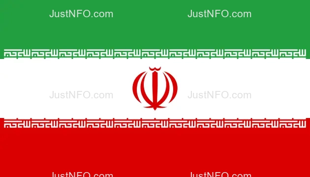 صورة علم إيران الرسمي بثلاثة أشرطة أفقية بالألوان الأخضر والأبيض والأحمر، يتوسطها الرمز الوطني المكوَّن من كلمة "الله" باللون الأحمر، وتُكتب عبارة "الله أكبر" بخط كوفي مكرر على حواف الشريطين العلوي والسفلي