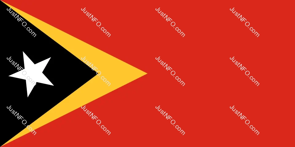 صورة علم تيمور الشرقية الرسمي بخلفية حمراء ومثلثين أصفر وأسود يحتوي أحدهما على نجمة بيضاء، رمز الاستقلال والوحدة الوطنية