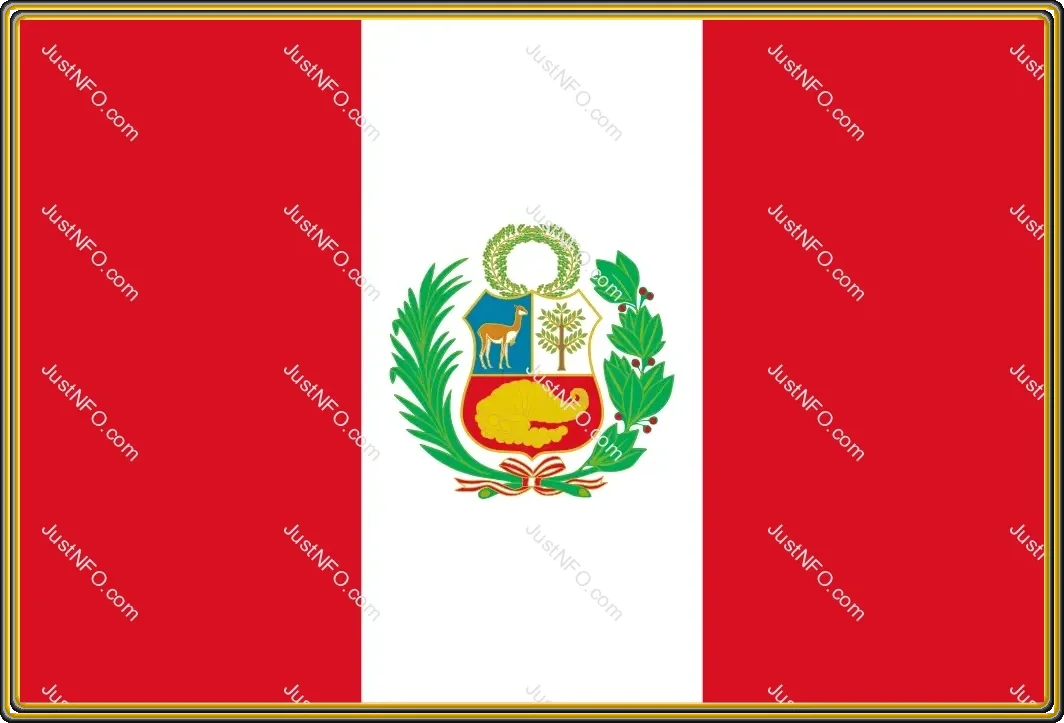 صورة علم بيرو المكوّن من ثلاثة أشرطة عمودية: الأحمر على الجانبين والأبيض في الوسط، وتتوسطه نسخة الدولة من الشعار الوطني الذي يضم الدرع المقسم إلى ثلاثة رموز: شجرة الكينا، حيوان الفيكويا، وقرن الوفرة الذهبي. يعكس العلم التراث الوطني والطبيعة الغنية للبلاد.