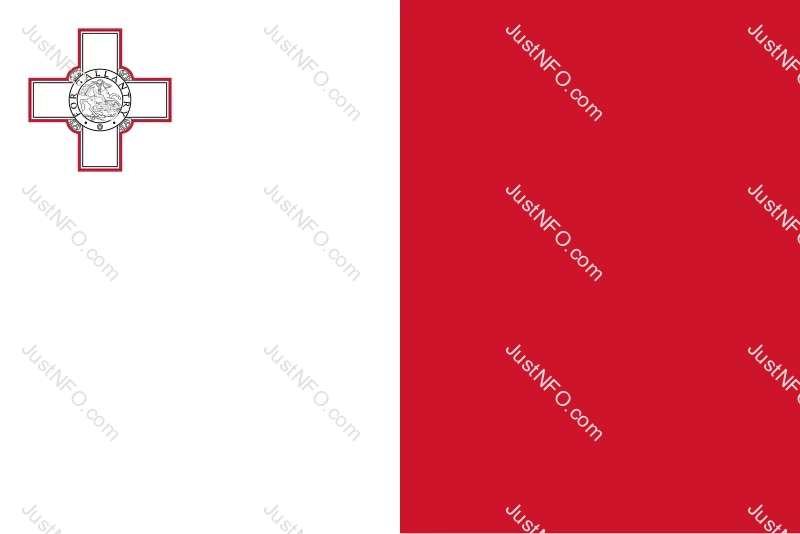 صورة علم مالطا الرسمي المكوّن من شريطين عموديين؛ الأبيض على اليسار ويرمز إلى السلام والنقاء، والأحمر على اليمين ويرمز إلى الشجاعة والتاريخ العسكري، مع وجود صليب جورج في الركن العلوي الأيسر تقديرًا لشجاعة الشعب المالطي خلال الحرب العالمية الثانية