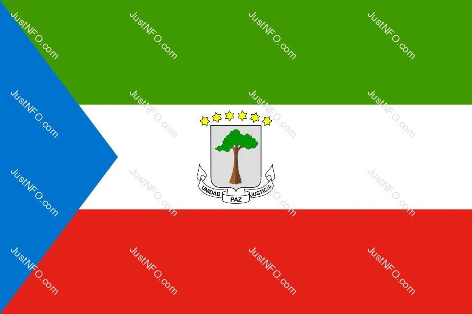 صورة علم غينيا الاستوائية الرسمي الذي يتكون من ثلاثة أشرطة أفقية بالأخضر والأبيض والأحمر، ومثلث أزرق على اليسار، يتوسطه شعار الدولة الذي يحتوي على شجرة القطن وست نجوم تمثل الجزر الوطنية