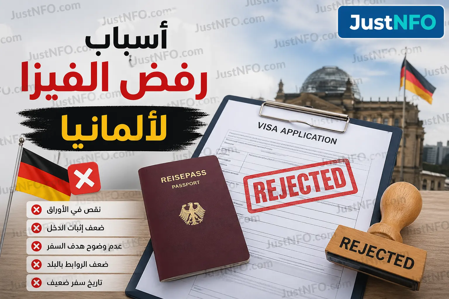 صورة توضيحية عن أسباب رفض فيزا ألمانيا، تعرض نموذج طلب تأشيرة مع ختم الرفض، وجواز سفر ألماني، وقائمة بالأسباب الشائعة مثل نقص الأوراق وضعف الحساب البنكي، مع تصميم احترافي يحمل علامة JustNFO.com كهوية للموقع.