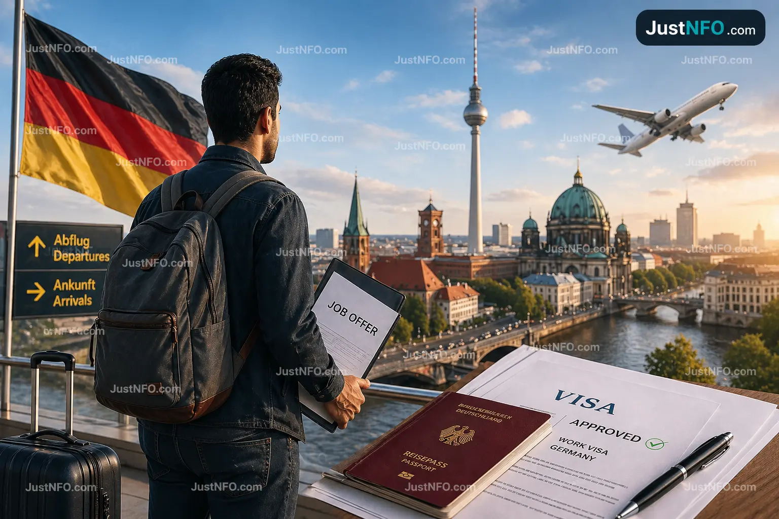 شاب يحمل عرض عمل وجواز سفر يستعد للسفر إلى ألمانيا للعمل 2026